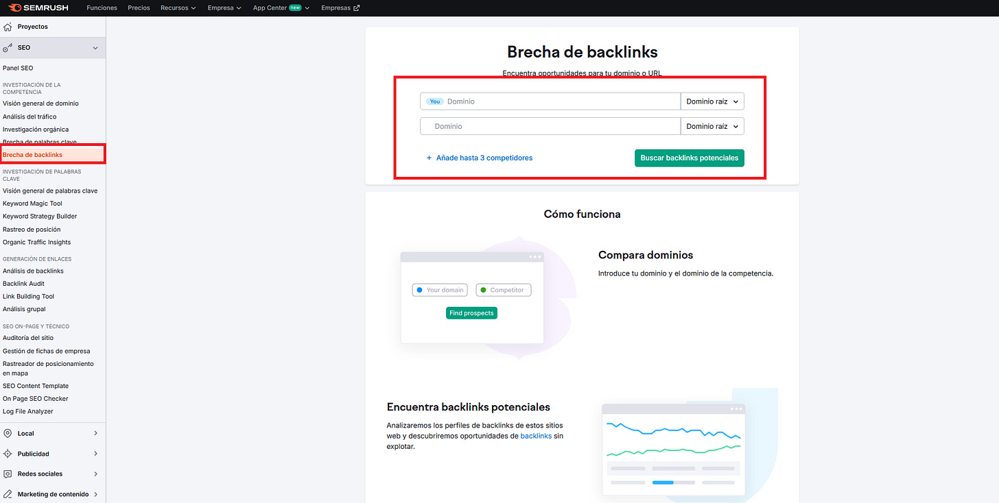 En el caso de Semrush, en la sección de investigación de la competencia, tienes una apartado que se llama Brecha de backlinks.