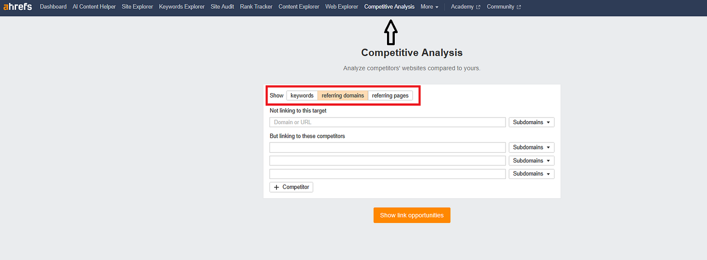 Para ahrefs puedes usar la función Competitive Analysis que te permite añadir tu dominio y los de la competencia, pudiendo extraer los dominios de referencia que tienen tus competidores.